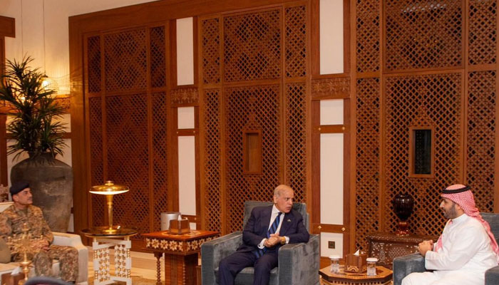 وزیر اعظم کے ہمراہ فیلڈ مارشل سید عاصم منیر اور نائب وزیر اعظم و وزیر خارجہ اسحاق ڈار بھی تھے، جنہوں نے مشرق وسطیٰ میں بڑھتی ہوئی کشیدگی کے درمیان سعودی ولی عہد محمد بن سلمان سے ملاقات اور بات چیت کی۔