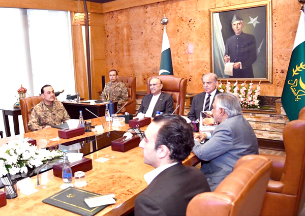 ISLAMABAD: President Asif Ali Zardari chairing a high-level meeting at Aiwan-e-Sadr along with Prime Minister Muhammad Shehbaz Sharif, Field Marshal Syed Asim Munir, and cabinet members. NNI, March 26, 2026